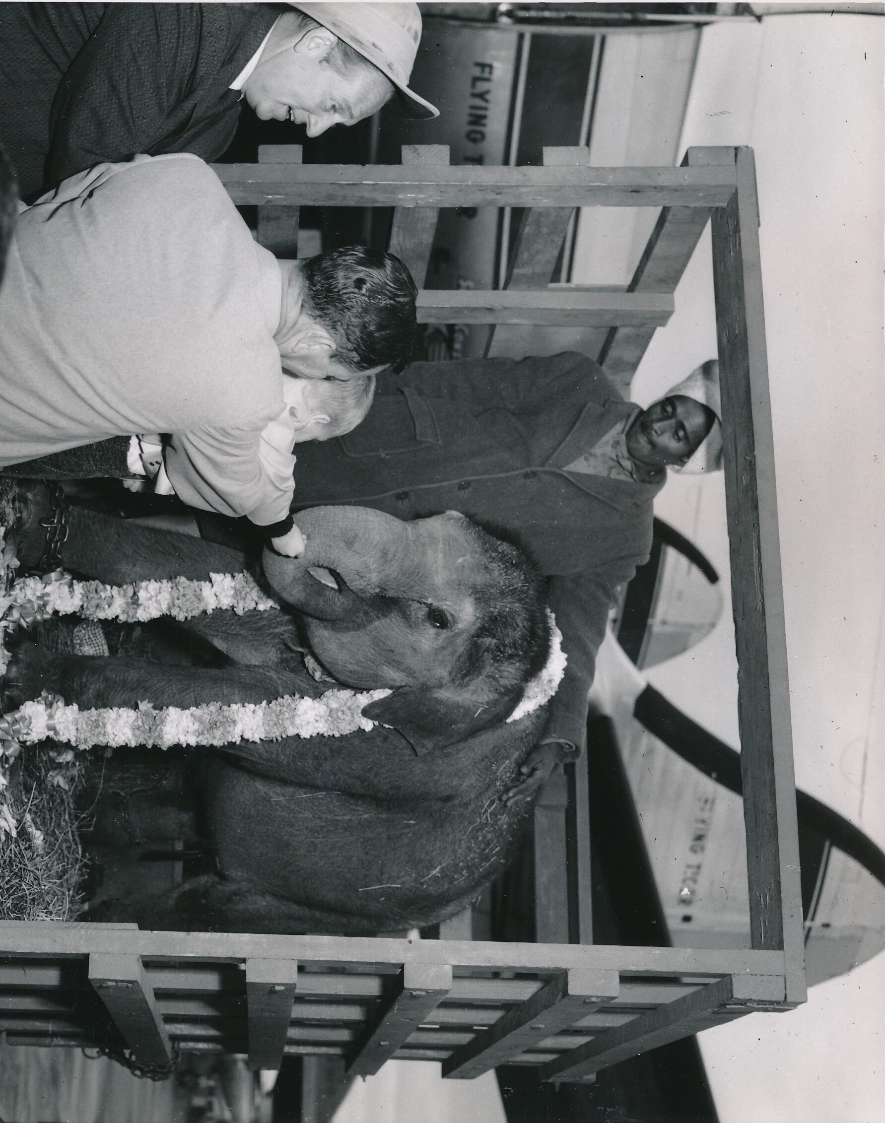 Shown is founder Robert W. Prescott with his son, Peter, accompanied by Art Linkletter in Burbank greeting Sita, a 700-pound 18-month-old baby elephant flown from India on a Super Constellation in December, 1959.