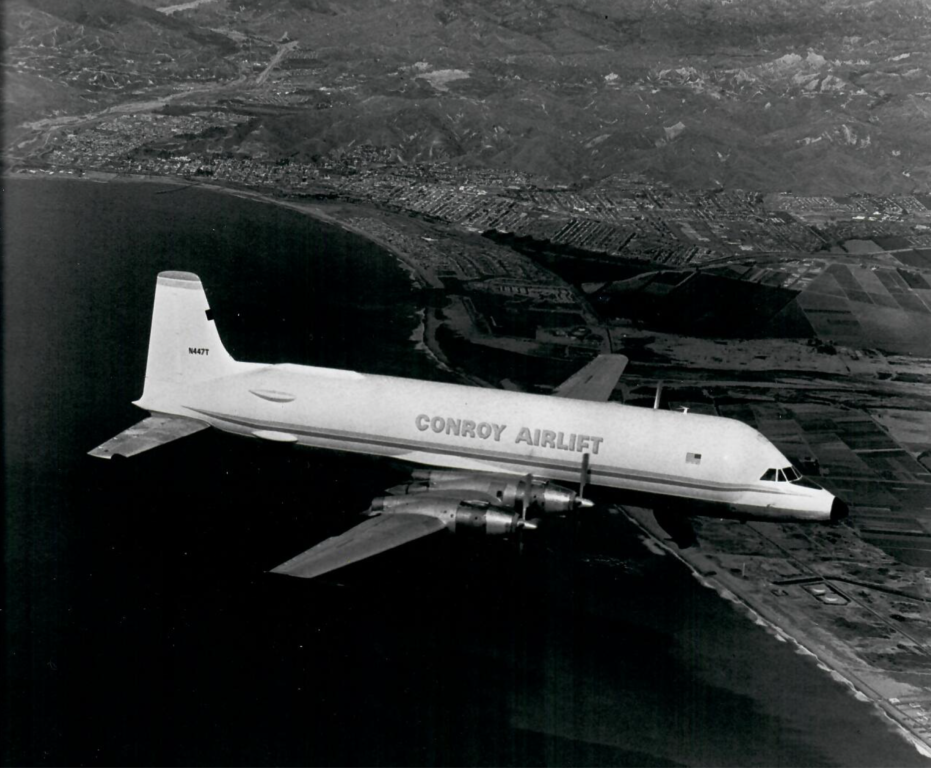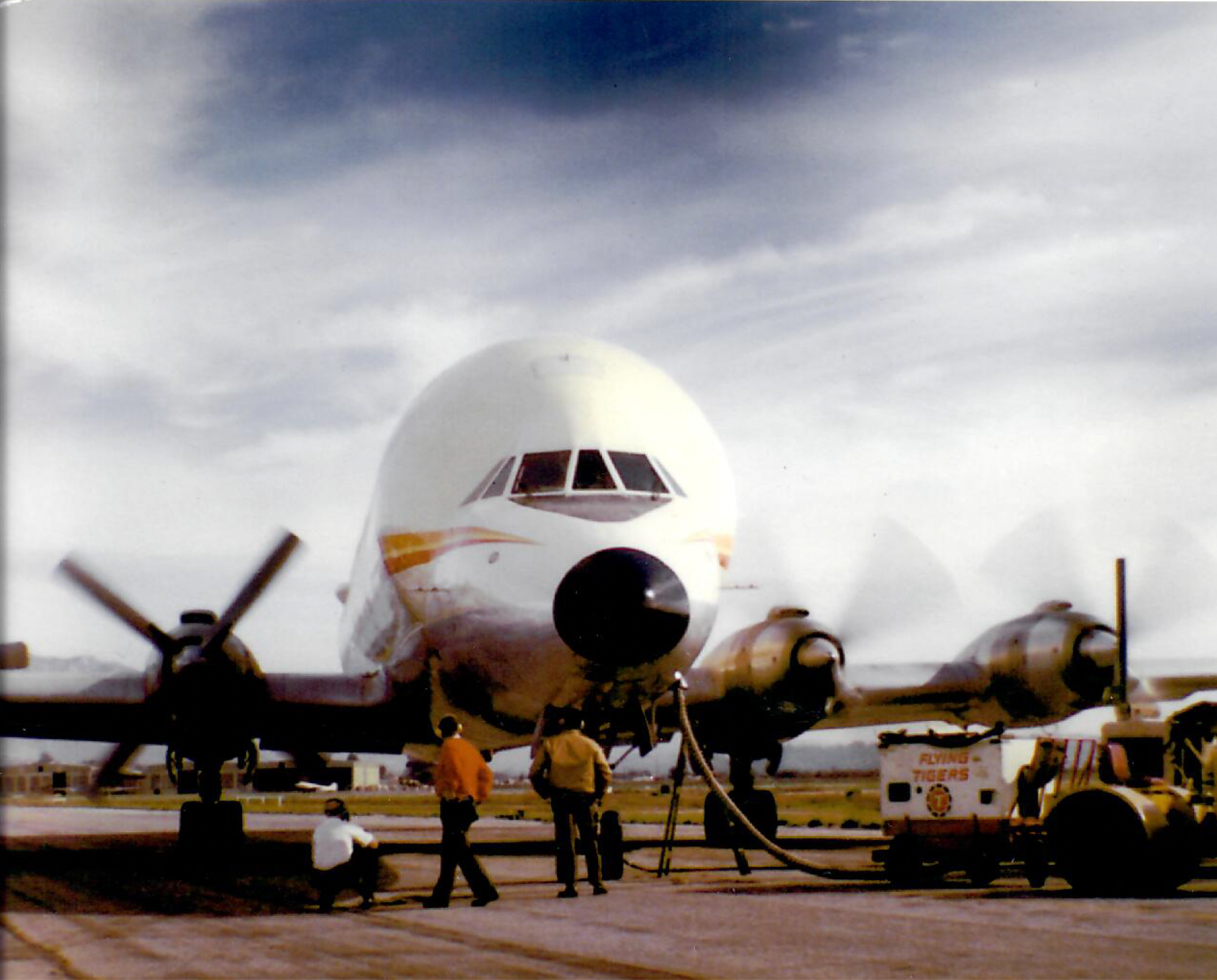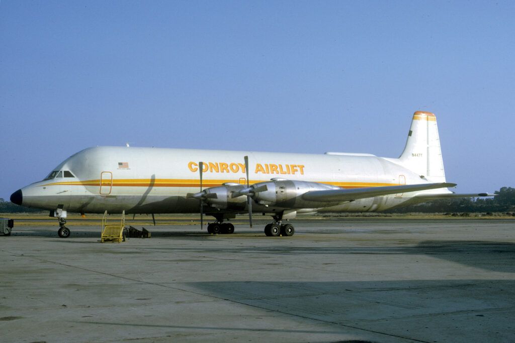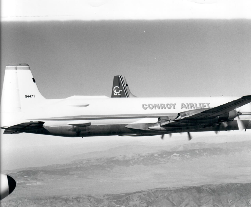 In December 1968, the aircraft was sold to Conroy Aircraft Corporation and converted into the CL-44-O “Oversize”, a unique modification designed for transporting large jet engines, oil drilling rigs, prefabricated housing, and other oversized cargo. Specifically the aircraft was designed to transport Rolls-Royce RB.211 jet engines from Belfast, Northern Ireland, to Palmdale, California for installation on the new Lockheed L-1011 TriStars. The conversion involved removing the upper half of the fuselage, an 84-foot section weighing nearly 5,000 pounds, increasing the aircraft’s interior diameter to 14 feet 9 inches and doubling its cargo capacity. The aircraft took its first flight in its new configuration on November 26, 1969. The flight crew for this certification test flight were Herman “Fish” Salmon, famed Lockheed test pilot, Captain Jim Seymour (FTL) and Jeff Seideman (FTL) who was on furlough but still possessed a current CL-44 rating to operate as the Flight Engineer